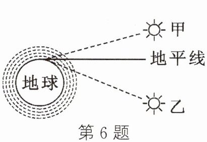 6. 人观察到的落日并非太阳的实际位置(如图所示),而是太阳光经过不均匀的大气层发生了______所成的像,太阳实际在图中______(甲/乙)的位置。人眼所看到的太阳是______(实/虚)像。