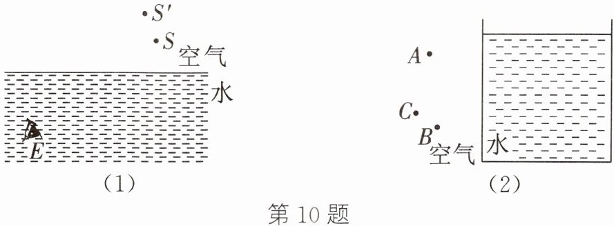 10. (1)如图所示,在平静的湖边有一盏路灯标记为S,潜水爱好者在水下E处看到路灯的像为S'。请画出:水下E处的人看到路灯S的入射光线;根据平面镜成像特点画出路灯S通过水面所成的像A。