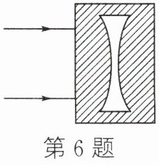 6. 炎炎夏日,太阳光透过汽车内的矿泉水瓶后可能把车内易燃物引燃,这是因为装有水的矿泉水瓶相当于一个______透镜,会使光线______。如图所示,中间为“空气”的玻璃砖会对光线起______(会聚/发散)作用。