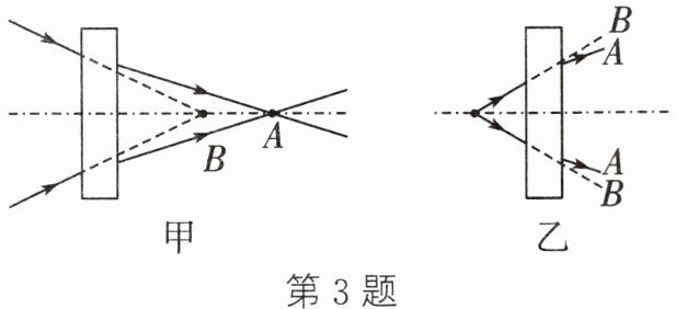 3. 一束光经过图甲一个透镜后会聚于主轴上的点A,去掉透镜后,光会聚于点B,则该透镜起到______(会聚/发散)作用,是______透镜,由此说明,能会聚光线于一点的透镜______(一定/不一定)是凸透镜。另一束光经过图乙一个透镜后沿A方向发散,去掉透镜后,沿B方向发散,则该透镜起到______(会聚/发散)作用,是______透镜,由此说明,不能会聚光线于一点的透镜______(一定/不一定)是凹透镜。