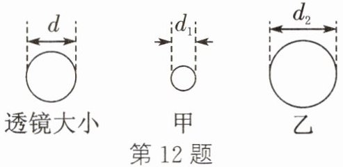12. (1)小明在判别直径相同的两透镜的类型时,分别将它们正对太阳,把一张纸放在它们的下方,在纸上得到相应的光斑,透镜与光斑的大小如图所示($d_{1}\lt d\lt d_{2}$)。其中形成甲光斑的______是凸透镜,形成乙光斑的______是凹透镜。(一定/可能/一定不)