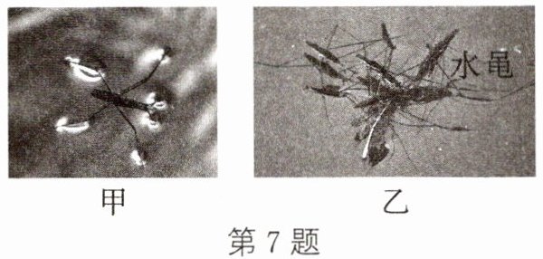 7. (2024·威海)摄影爱好者拍摄到“站”在水面上的水黾(一种昆虫)纤细的腿使水面发生了形变,如图甲所示;同时看到水底有带“光环”的暗影,如图乙所示。此时“形变的水”相当于______(填光学元件名称);当水黾游到水浅的地方,暗影面积会______(变小/不变/变大)。