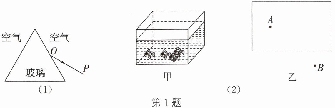 1.(1)一束光线从空气中斜射入玻璃三棱镜,经过两次折射后从 OP 射出,请画出完整光路。