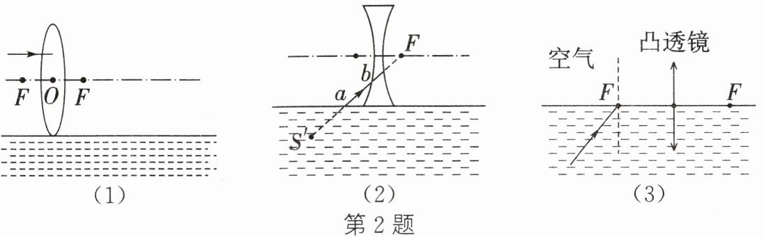 (2)S'是点光源S(未画出)在水中所成的像,S 发出的一条光线经水面反射后沿 ab 方向恰好射向凹透镜右侧焦点 F。请画出点光源 S 的位置以及光线 ab 经凹透镜后的折射光线。