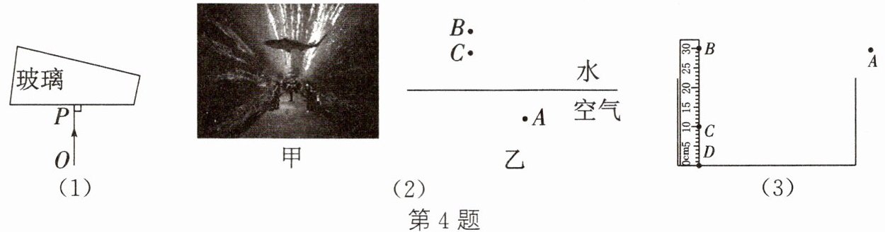 (3)为测量容器中水的深度,一同学将刻度尺竖直插入水中,如图所示。从 A 处向水中看去,看到刻度尺上 B 点在水中所成的像位于 C 点,同时看到水中 D 点的像也位于 C 点。请据此:
