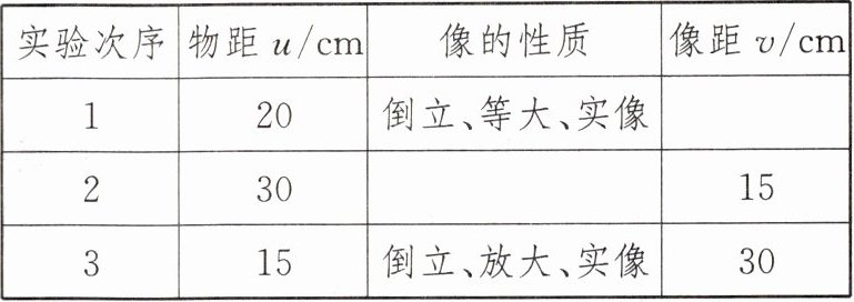 |实验次序|物距u/cm|像的性质|像距v/cm|