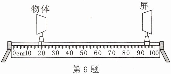 9. 在“探究凸透镜成像的规律”的实验中,小明用高为4 cm的电子发光体作为物体,把凸透镜固定在光具座50 cm刻度线处不动,如图所示。下表是小明记录的凸透镜成实像时的部分实验数据: