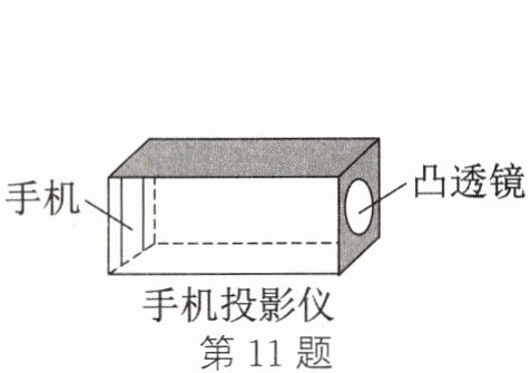 11. (2024·聊城)在学习了凸透镜成像规律后,小慧同学计划制作一个“手机投影仪”。现有器材如下:焦距分别为10 cm、20 cm、30 cm的凸透镜各一个,手机一部,长为30 cm的纸盒,胶带和剪刀等。“投影仪”模型如图所示,将手机和凸透镜分别固定在纸盒的两端,调整“投影仪”到墙面的距离,可在墙上看到手机画面清晰放大的像。下列说法正确的是( )