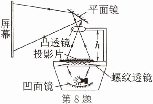 8. 如图是投影仪成像示意图,其中凸透镜的作用是______;平面镜的作用是______;要使屏幕上出现一个向上的“箭头”形状,投影片上的“箭头”应该朝______(左/右)放;要使屏幕上的像变大一些,应该将凸透镜适当向______(上/下)调节,并将投影仪______(远离/靠近)屏幕。如果图中h= 30 cm,则透镜焦距不能小于______。