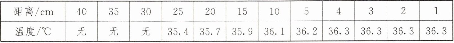 (1)他将自己手腕正对测温探头,逐渐靠近,测出相应温度如下表所示:
