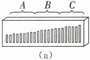 16. 如图(a)所示是口琴拆开后其内部的琴芯结构,在琴芯的气孔边分布着长短、厚薄都不同的一排铜片,A区的较薄、较短、振动快,而C区的较长、较厚、振动慢。