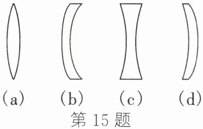 15. 如图所示的透镜中属于凹透镜的有b、c、d(填字母);极少数游客在山上游玩时随意丢弃玻璃瓶,这样做可能引起山林火灾。这是因为盛有水的瓶子相当于凸透镜,对光线有会聚作用,阳光经折射后,可能引燃枯叶。