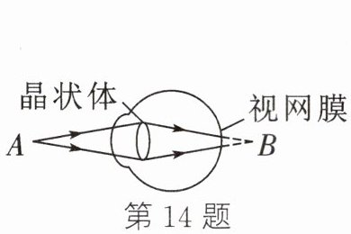 14. 人眼睛中的晶状体相当于凸透镜,如图所示,物体A经过眼睛成像在视网膜后面的B点,这是远视(近/远)视眼成像的情况图。要想成像在视网膜上,则物体A应该向左(左/右)移动;如果不移动物体,也想成像在视网膜上,则应戴凸透镜做成的眼镜。