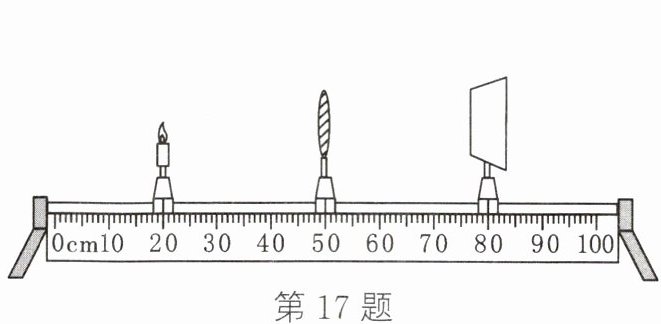 17. (2024·苏州)探究凸透镜成像规律的实验中,蜡烛、凸透镜、光屏的位置如图所示,光屏上恰好成清晰的像,该像是倒立、缩小的实像,此凸透镜的焦距是15.0 cm。凸透镜和光屏位置不动,将蜡烛远离凸透镜,给凸透镜“戴上”合适的凹透镜,可再次获得清晰的像。