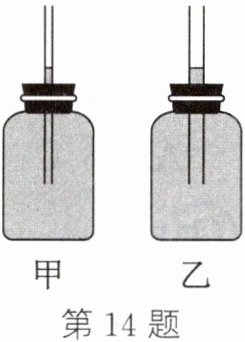 14. 在进行实践活动展示时,两位同学都带来了自制的温度计,如图所示。他们所用的玻璃小瓶相同,里面装满同种带颜色的水,在小瓶口上各插进一根吸管。两个温度计是根据______的原理制成的,不同之处是吸管的粗细不同,甲比乙的横截面积______。用它们测量相同的温度时,吸管______的水柱高度的变化较大,灵敏度高。