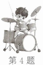 4. 如图,在演奏架子鼓时,敲击小军鼓与镲片发出的______不同,大通鼓与小通鼓发出的______不同,轻踩大鼓与重踩大鼓时发出的______不同。