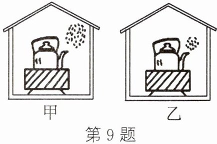 9. 如图,两个相同的水壶内装有同样多的水,此时都已沸腾。壶口冒出“白汽”是______现象。若炉火的强度和房间内空气的湿度都相同,就此可以判断得出:房间甲的气温______(高于/等于/低于)房间乙的气温。