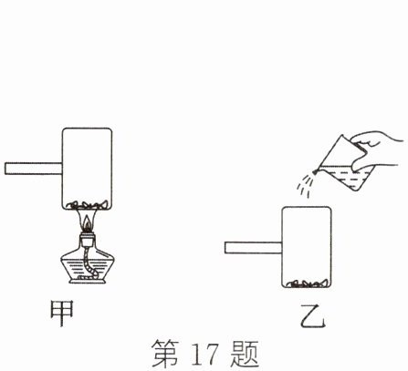 17. 在碘的升华实验中,小红直接把装有少量碘颗粒的封闭玻璃容器放在酒精灯火焰上加热;小明向装有少量碘颗粒的封闭玻璃容器浇热水,结果两容器内都出现了碘蒸气。已知碘的熔点是$114^\circC$、沸点是$184.35^\circC$;水的沸点是$100^\circC$;酒精灯火焰温度约为$500^\circC$。下列说法正确的是( )