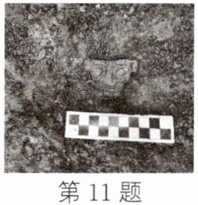 11. (2024·威海)三星堆祭祀区8号坑出土了一件迷你版纵目面具,工作人员按照考古挖掘的要求用比例尺作参照拍照,每一个小方格的宽度为1 cm,如图所示。请估测面具两耳之间的距离更接近于( )