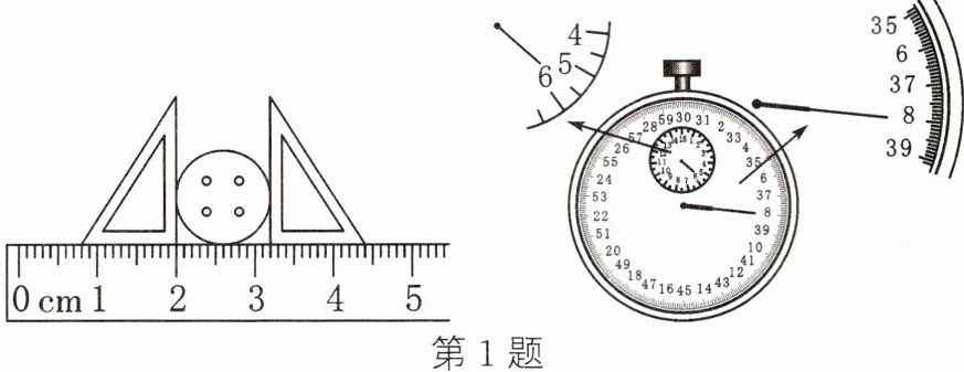 1. 如图所示,用刻度尺和三角板测得纽扣的直径是______cm;机械停表的示数是______s。