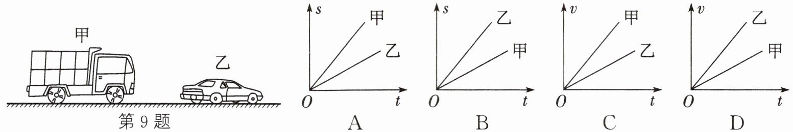 9. 一辆卡车甲和一辆汽车乙同时从同一地点出发,向右做匀速直线运动,一小段时间后它们的位置关系如图所示,图中能正确反映两车运动情况的图像是(B)