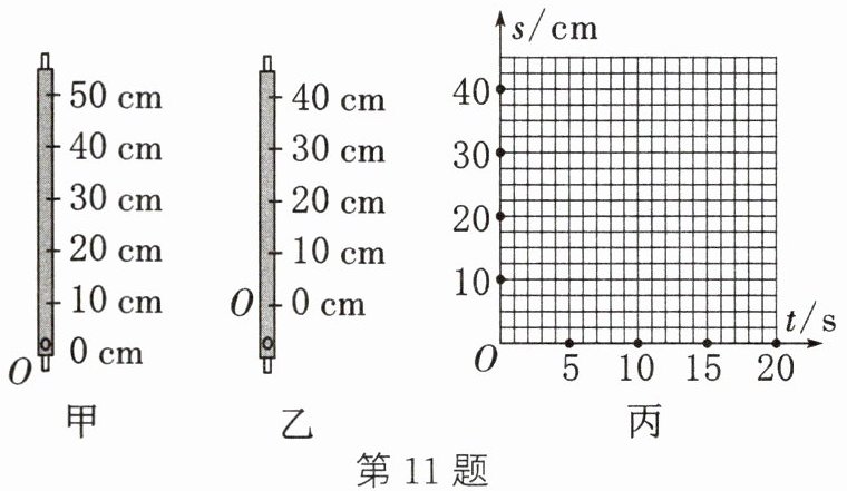 11. 在“探究气泡的运动规律”时,在内径约为1 cm、长为60 cm的玻璃管中注入水,管内留一个小气泡后封住开口,将玻璃管翻转后竖直放置,观察气泡的运动情况,如图。