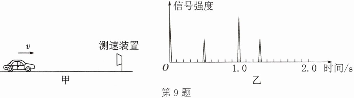 9. 如图甲所示,在高速公路上一辆轿车做匀速直线运动,在其正前方有一固定的超声波测速装置。该装置每隔1s发射一束超声波脉冲信号,每个脉冲信号持续时间极短,超声波遇到轿车后立即返回,返回信号被超声波测速装置接收,经过计算机处理自动计算出车速。如图乙所示是该测速装置连续发射和接收两次信号的波形图。已知发射第二个脉冲信号时第一个脉冲信号已被接收,超声波在空气中的传播速度为340m/s,根据图像获得的信息计算: