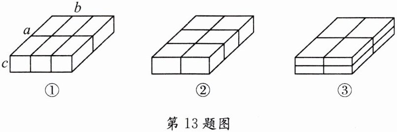 13. 小丽为妈妈准备了一份生日礼物,礼物外包装盒为长方体,长、宽、高分别为$a$、$b$、$c(a>b>c)$.为了美观,小丽决定在包装盒外用丝带打包装饰,她发现,可以用如图所示的三种方式打包,所需丝带的长度分别为$l_{1}$、$l_{2}$、$l_{3}$(不计打结处丝带的长度).试用含$a$、$b$、$c的代数式分别表示l_{1}$、$l_{2}$、$l_{3}$.
