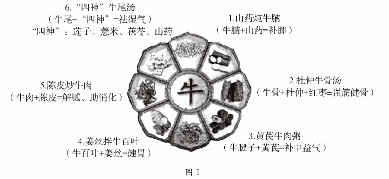 食疗养生,药食同源。《中华饮膳》其中一期介绍了以牛肉为主要食材,分别配以山药、杜仲、黄芪、陈皮等,六种养生菜(图 1)的制作方法及具有的养生健体功效。