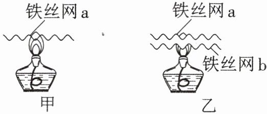 (1)“火焰分割”。先将加热至红热的铁丝网a平伸到火焰上部,如图甲所示,再将常温的铁丝网b平伸到火焰下部,两张铁丝网中间的火焰熄灭,如图乙所示。