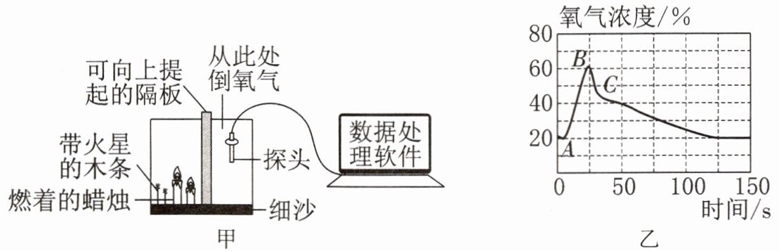 7.某实验小组为探究氧气的性质,利用如图甲装置和氧气浓度传感器测得氧气浓度随时间变化的曲线图(如图乙)。B点时,将隔板稍向上提起,下列通过装置和数据获得的信息,不正确的是 (