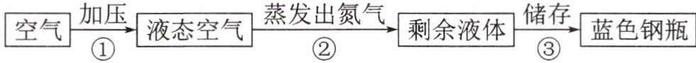 空气$\xrightarrow[①]{加压}液态空气\xrightarrow[②]{蒸发出氮气}剩余液体\xrightarrow[③]{储存}$蓝色钢瓶