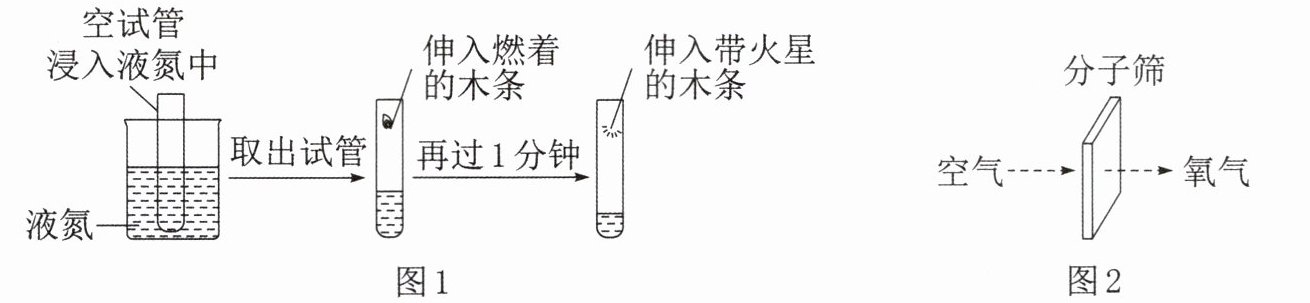 浸入液氮一段时间后,试管内产生一定体积的液态空气。取出试管,液态空气沸腾,伸入燃着的木条,木条熄灭,导致木条熄灭的原因是______液氮的沸点低,先汽化出来,氮气不能支持燃烧______;1分钟后伸入带火星的木条,观察到木条复燃,导致木条复燃的原因是______液氧的沸点高,后汽化,氧气具有助燃性______。