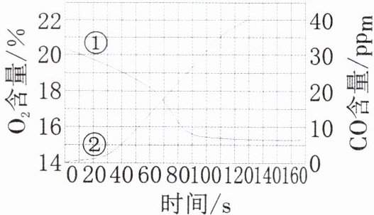 14. 实验室测定蜡烛在盛有一定体积空气的密闭容器内燃烧至熄灭过程中$,O_2$和CO的含量随时间变化曲线如图,通过分析该图可推理出的结论是(