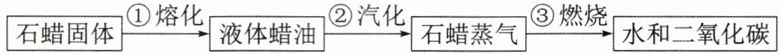 石蜡固体$\xrightarrow{①熔化}液体蜡油\xrightarrow{②汽化}石蜡蒸气\xrightarrow{③燃烧}$水和二氧化碳