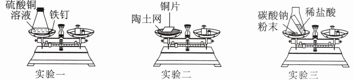 (3)实验三中,已知:$Na_{2}CO_{3}+2HCl= 2NaCl+H_{2}O+CO_{2}\uparrow$,观察到反应后天平不平衡,从物质变化的视角解释原因: