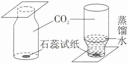 5. (2024·泸州)向一集满$\mathrm{CO}_{2}$的集气瓶中放入一片蓝色石蕊试纸,注入适量的蒸馏水,盖上玻璃片,上下振荡,再将其倒置(如图),把手移开,玻璃片没有掉下来。蓝色石蕊试纸在注入蒸馏水并振荡后变红。依据现象一定能得出对应的结论是 (
