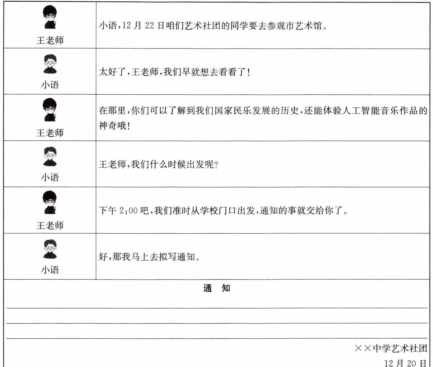 12月20日上午,艺术社团辅导员王老师找小语商量社团的相关事宜,下面是他们聊天记录的截图,请你根据他们的对话内容,帮小语拟写一则通知。
