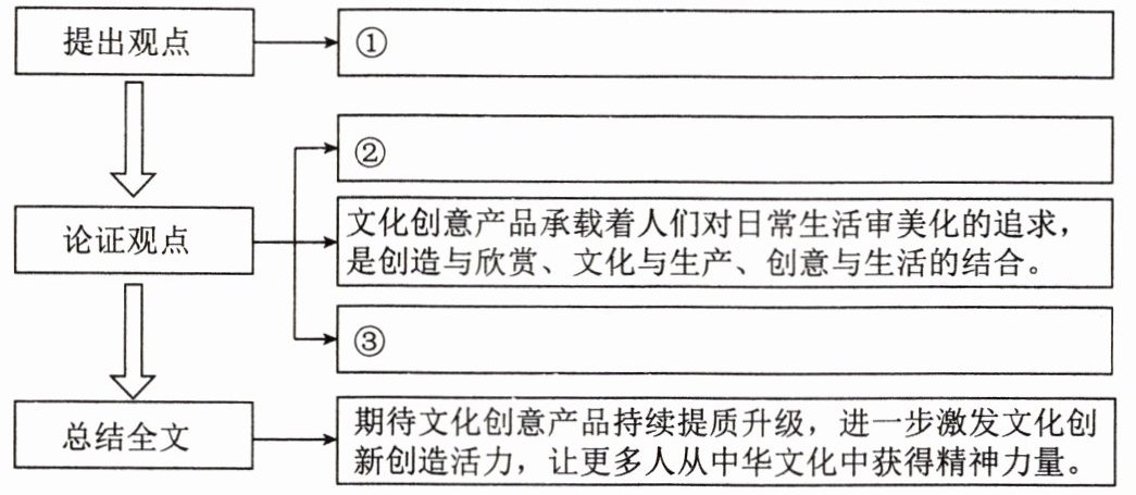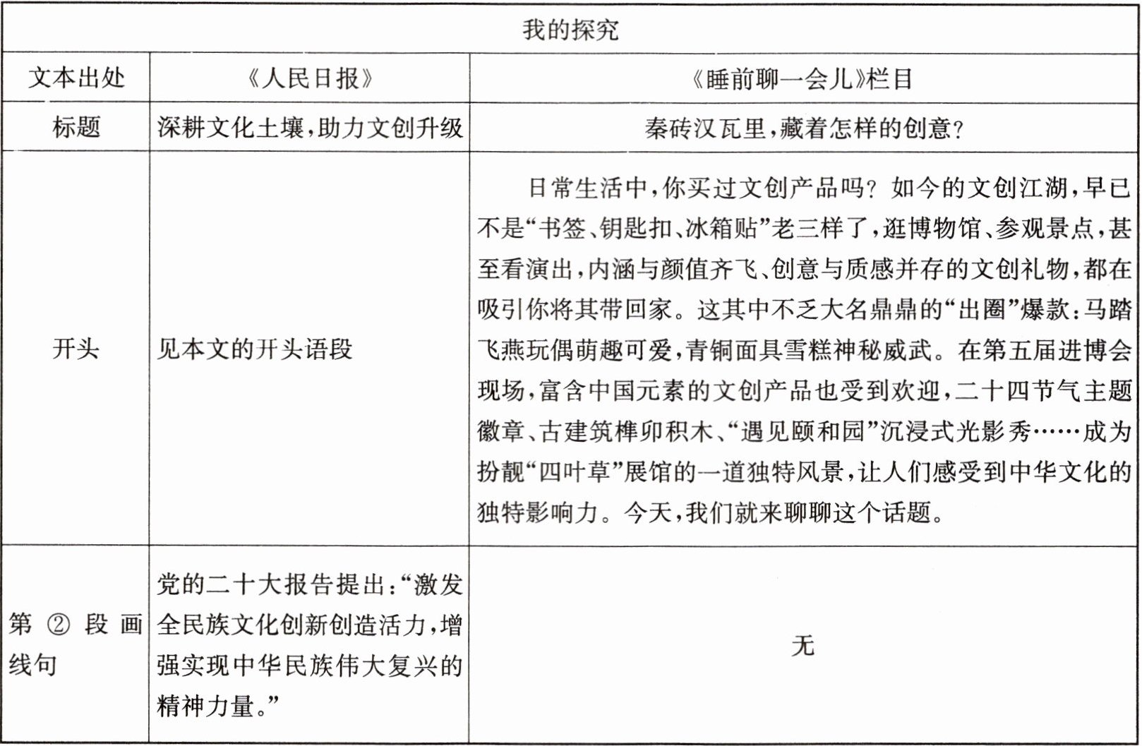 1. ①文创产品要深耕文化土壤。 ②高质量的文创产品,需要以恰当的创意形式,将历史内涵与时代审美相结合,达到文化价值与实用价值相统一。 ③文创产品的持续创新,离不开数字技术赋能。(每空2分) 2. 示例:①我选择“标题”。在《人民日报》中,作者用的标题是《深耕文化土壤,助力文创升级》,我们可以从标题中提炼出文章的观点,对文章的主要内容一目了然,此标题符合新闻的写作方法。(4分)而在《睡前聊一会儿》栏目中,标题为《秦砖汉瓦里,藏着怎样的创意?》,这是一个疑问式的标题,更能激发读者的阅读兴趣,在表述上让人感觉更为轻松,与该栏目情境相吻合。(4分) ②我选择“开头”。在《睡前聊一会儿》栏目中,文章的开头以问句的形式让读者进入回忆,以聊天的方式设置情境,让人在睡前轻松愉悦地阅读。(4分)而在《人民日报》中,文章的开头直接针对新闻素材引出文章的论点,符合新闻的写作特点。(4分) ③我选择“第②段画线句”。本文第②段画线句引用了党的二十大报告内容,是为了论证“开发出一大批彰显中华美学风格、适应现代生活需要、符合市场需求的文化创意产品,是文化创新创造活力的体现,也是不断提升国家文化软实力和中华文化影响力的要求”这一观点,增强了文章的说服力。(4分)同时《人民日报》作为面向全国人民发行的报刊,引用了党的二十大报告内容更体现了新闻的时效性和导向性。而《睡前聊一会儿》栏目则为轻松愉快的聊天栏目,无须引用该材料来增强说服力。(4分) (任选两处不同分析即可)