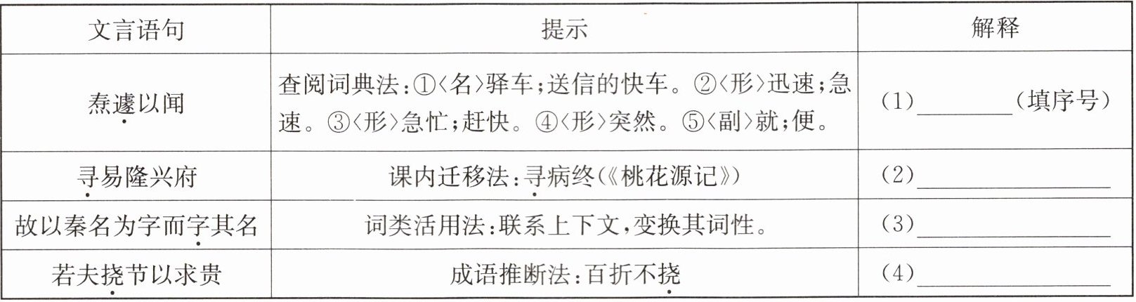 |焘遽以闻|查阅词典法:①〈名〉驿车;送信的快车。②〈形〉迅速;急速。③〈形〉急忙;赶快。④〈形〉突然。⑤〈副〉就;便。|(1)______(填序号)|