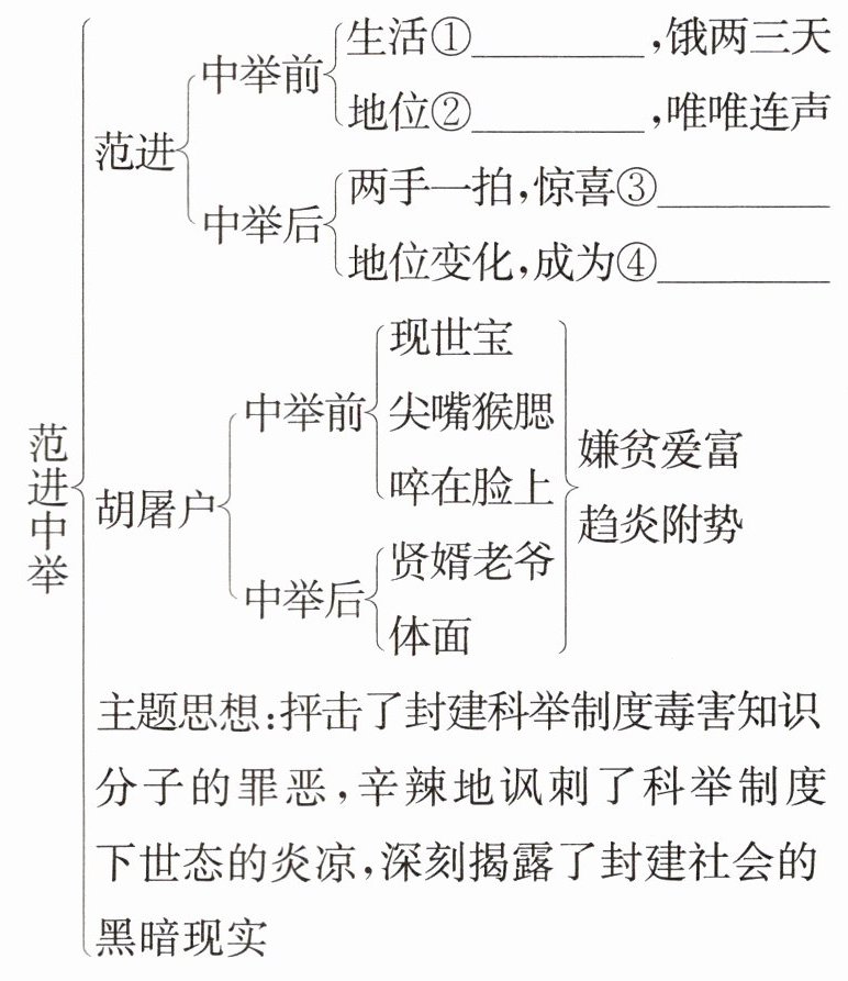 主题思想:抨击了封建科举制度毒害知识分子的罪恶,辛辣地讽刺了科举制度下世态的炎凉,深刻揭露了封建社会的黑暗现实