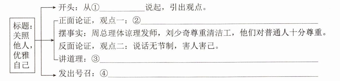 4. 潇潇读完上述材料后,准备参加“做言行优雅的中学生”主题演讲,请你根据三则材料帮她完成演讲提纲。(4 分)