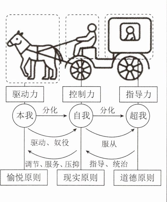 1.B(2分)【解析】A项,由材料一中"当两个人、两个群体交往时,他们可能因为某种需要或某个目标而产生冲突"可知,是"可能",不是"一定会";C项,由材料三"自我来自本我""超我是自我的一部分"可知,"'超我'也源自'本我'"推断错误;D项,由材料三"回应是你在理性思考下做出的有选择的积极应对,这是我们化解冲突、建立联结的关键"可知,是运用"理性思维",不是"感性思维"。2.①竞争 ②合作 ③回避 ④迁就 ⑤妥协(每空1分)3.①文字部分阐述了"本我""自我""超我"三者的基本内涵及相互关系;②和图像相比,文字表达更细致;③图像部分则将较复杂的文字转化为直观的图像,用箭头和图案对文字进行了补充,将三者之间的双向关系表达得更为直观、清晰。(每点1分)4.策略选择:合作或妥协策略。(1分)化解步骤:①表达观察结果:九年级学生自习需要安静,七年级学生排练喧闹不可避免。②表达感受:九年级学生想安静地自习,七年级学生想通过排练取得开幕式好的效果,两者的诉求都是合理的。③明确需要:七年级学生尽量降低喧闹声。④提出计划:七年级学生可以选择非自习时间段排练。(每点1分)【一课一得】示例:爱力愈大,所爱愈博。——李大钊