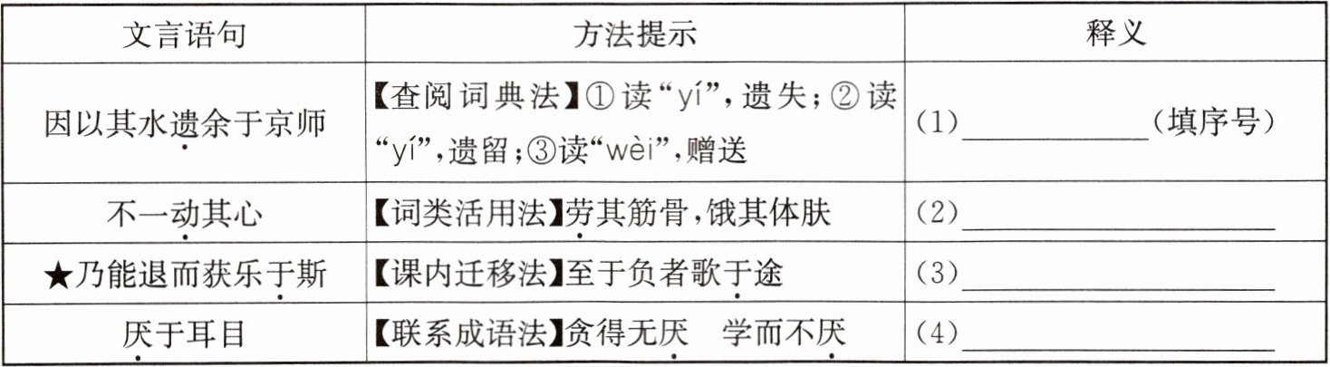 |因以其水遗余于京师|【查阅词典法】①读"yí",遗失;②读"wèi",赠送|(1) (填序号)|