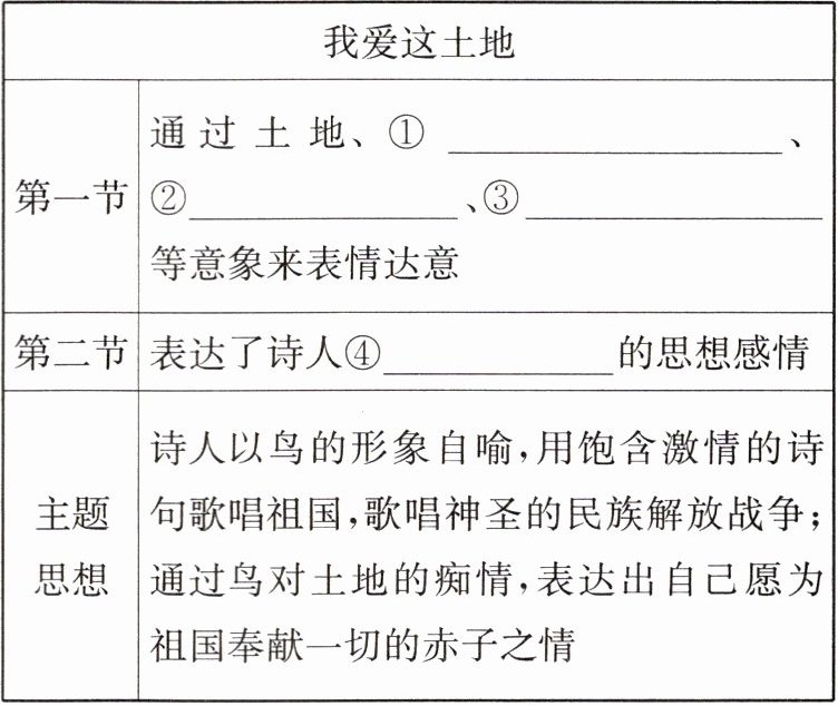 |主题思想|诗人以鸟的形象自喻,用饱含激情的诗句歌唱祖国,歌唱神圣的民族解放战争;通过鸟对土地的痴情,表达出自己愿为祖国奉献一切的赤子之情|