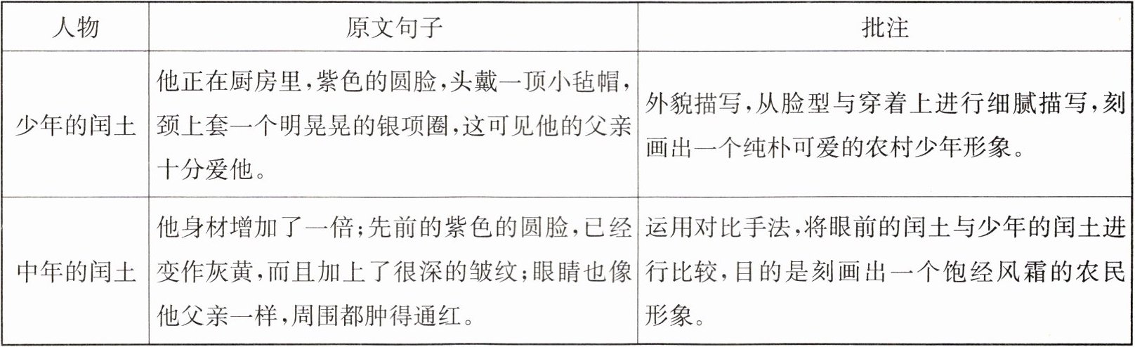 |中年的闰土|他身材增加了一倍;先前的紫色的圆脸,已经变作灰黄,而且加上了很深的皱纹;眼睛也像他父亲一样,周围都肿得通红。|运用对比手法,将眼前的闰土与少年的闰土进行比较,目的是刻画出一个饱经风霜的农民形象。|______
