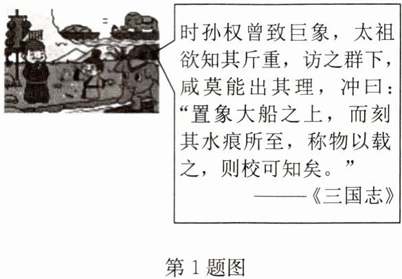 1. “曹冲称象”是流传很广的故事,如图。按照他的方法:先将象牵到大船上,并在船侧面标记水位,再将象牵出。然后往船上抬入 20 块等重的条形石,并在船上留 3 个搬运工,这时水位恰好到达标记位置,如果再抬入 1 块同样的条形石,船上只留 1 个搬运工,水位也恰好到达标记位置。已知搬运工的体重均为 120 斤,设每块条形石重 $ x $ 斤(1 斤 = 0.5 千克),则下列选项正确的是(