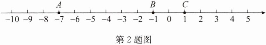 2. 如图,数轴上的三个点 $ A $,$ B $,$ C $ 表示的数分别是 $ - 7 $,$ - 1 $,$ 1 $。若动点 $ P $,$ Q $ 分别从点 $ A $,$ B $ 出发,以 $ 4 $ 个单位长度/秒和 $ 3 $ 个单位长度/秒的速度向左匀速运动,动点 $ R $ 从点 $ C $ 出发,以 $ 1 $ 个单位长度/秒的速度向右匀速运动,点 $ P $,$ Q $,$ R $ 同时出发,设运动时间为 $ t $ 秒。