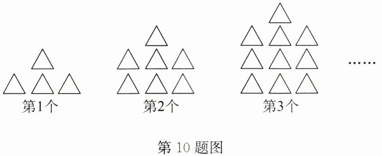10. (2024·牡丹江改编)如图是由一些同样大小的三角形按照一定规律所组成的图形,第 1 个图形有 4 个三角形,第 2 个图形有 7 个三角形,第 3 个图形有 10 个三角形,…,按照此规律排列下去,第 n 个图形中有
