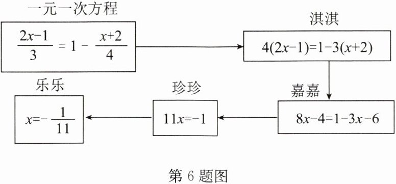 6. (2024·响水月考)小组活动中,淇淇所在小组采用接力的方式求一元一次方程的解,规则是每人只能看前面一人给的式子,并进行一步计算,再将结果传递给下一人,最后求出方程的解.过程如图,接力过程中,自己负责的一步出现错误的是 (